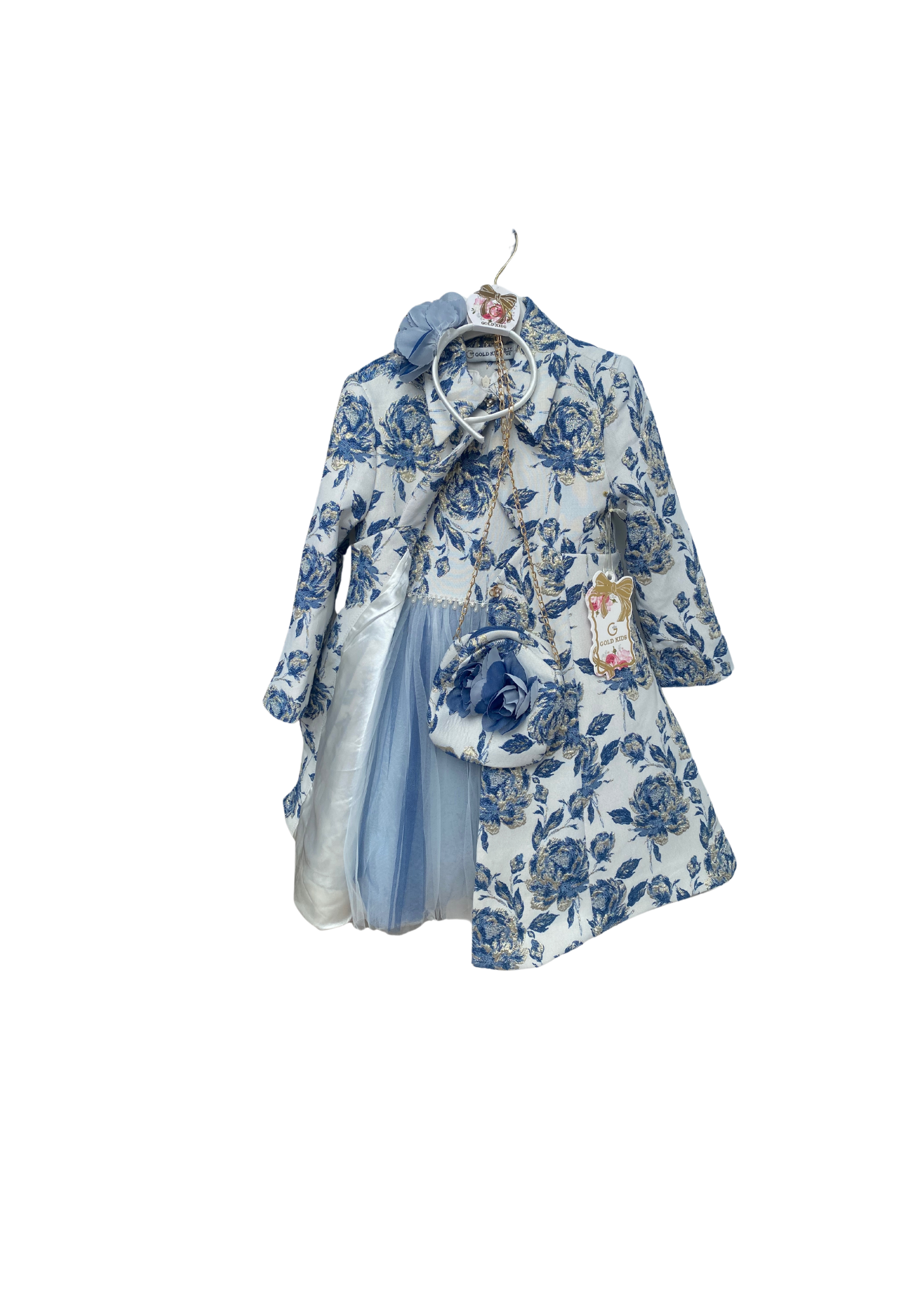 Introducing our exquisite blue and white dress, adorned with a captivating blue and white floral print. This stunning ensemble comes complete with a stylish jacket and a matching handbag, ensuring a coordinated and elegant look. Perfect for any occasion, this dress is designed to make you feel like a true princess, adding a touch of enchantment to your dreams.